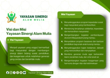 Yayasan Sinergi Alam Mulia didirikan pada bulan September 2025 dengan akta notaris yang disahkan oleh DONI FIRMANSYAH, SH, M.Kn. Pendirian ini dilandasi oleh kesamaan visi dan tekad para pengurus untuk membentuk lembaga yang berkomitmen membangun serta bersinergi dengan Santri Yatim, Piatu, dan Dhu'afa binaan, serta masyarakat sekitar.